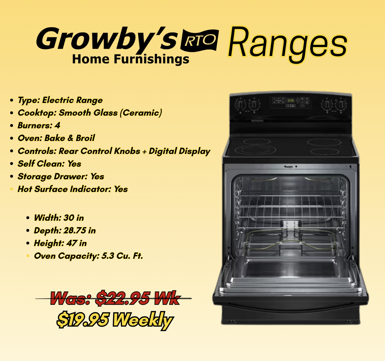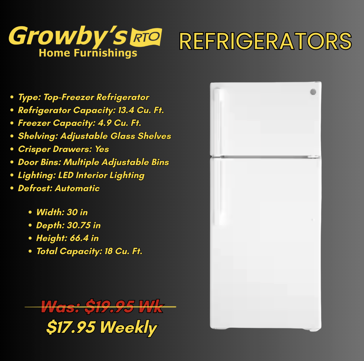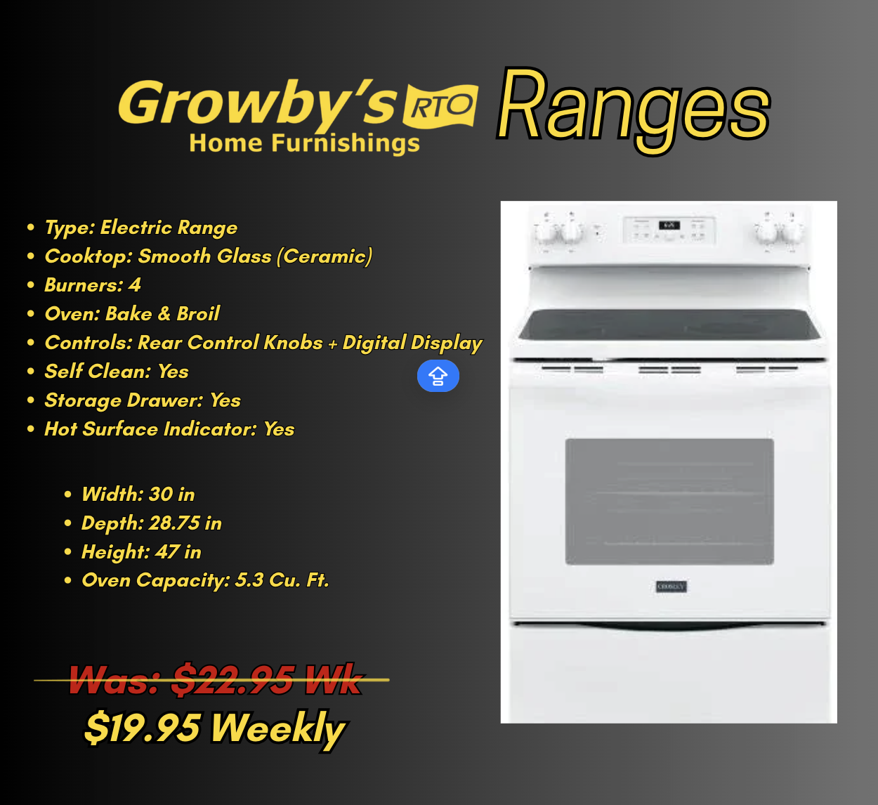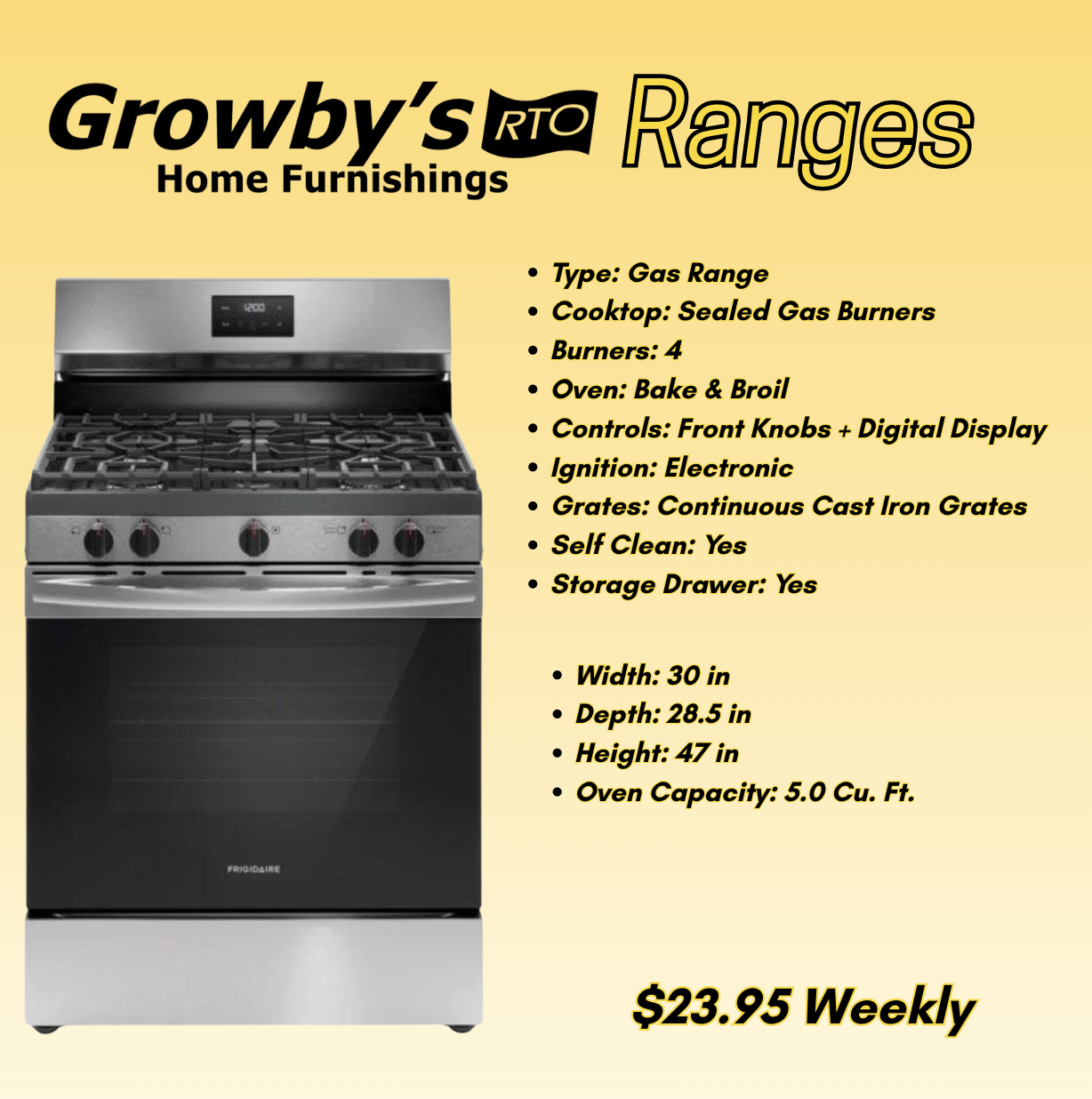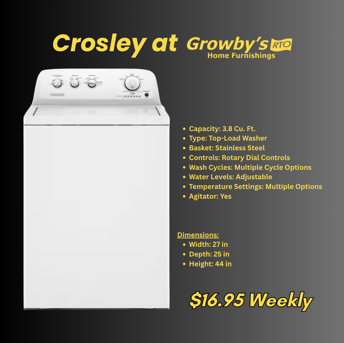 Cart price is a down payment and does not reflect your minimum contract payment. Minimum contract payments are disclosed above. If you are renting multiple items we will likely be able to give you a minimum payment that is less than your down payment and up to 6 months Same-As-Cash! All rental agreements come with free same day delivery and setup within our service area. All agreements subject to approval by Growby's RTO. Contact your local Growby's for terms and conditions. Exclusions may apply.